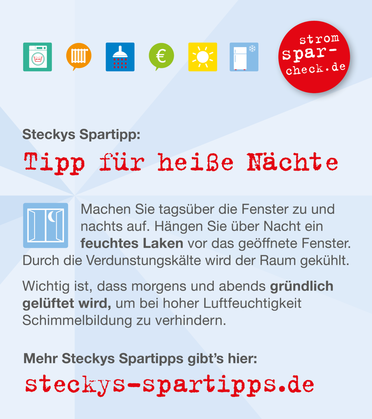 Lüften Sie gezielt: In den Morgen- und Abendstunden und immer, wenn es draußen kühler ist als drinnen, empfiehlt sich langes Stoßlüften, je nach Sonnenschein mit geöffneten Jalousien.